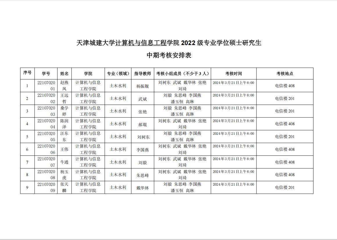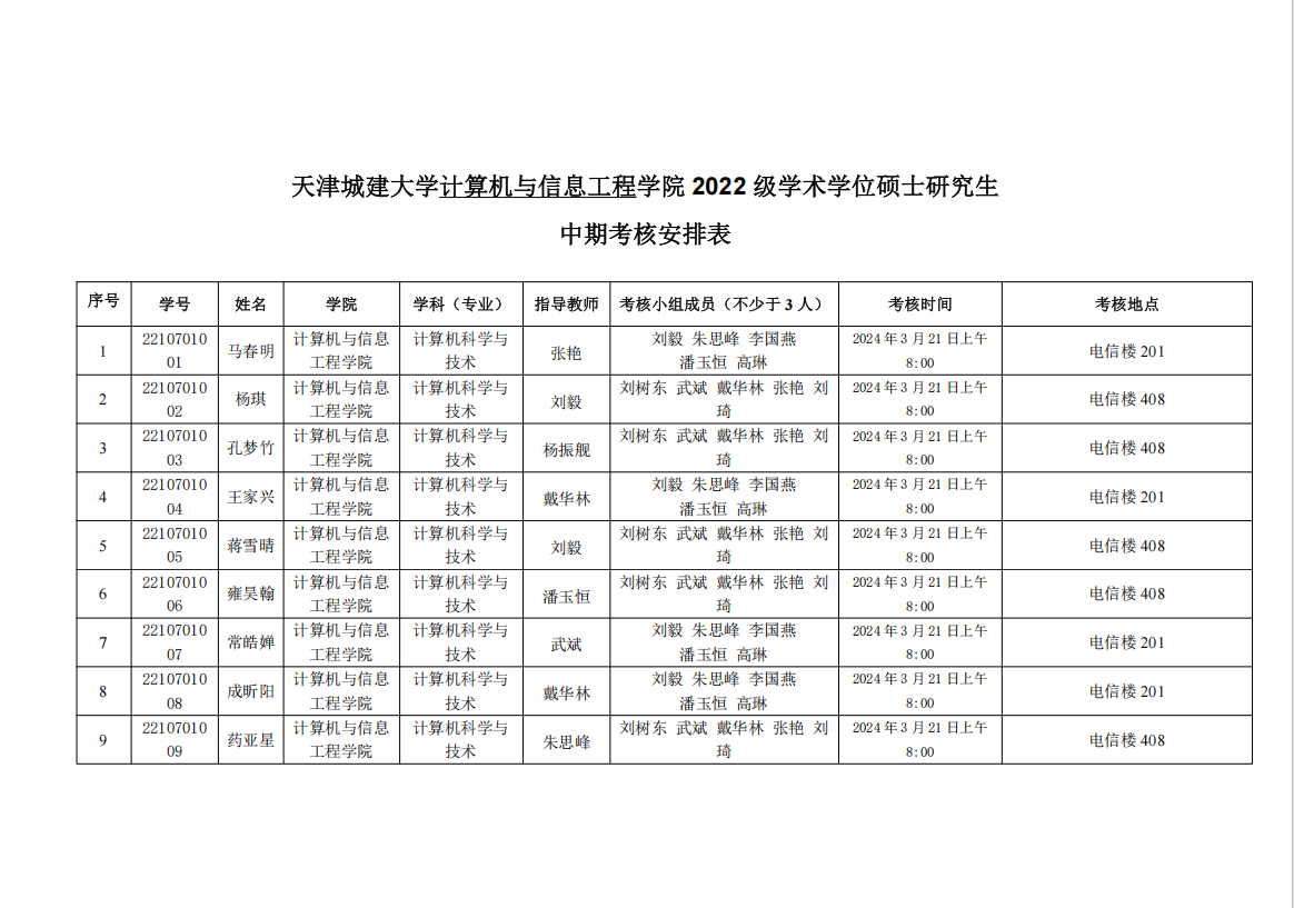 天津城建大学计算机与信息工程学院 2022 级学术学位硕士研究生 中期考核安排表