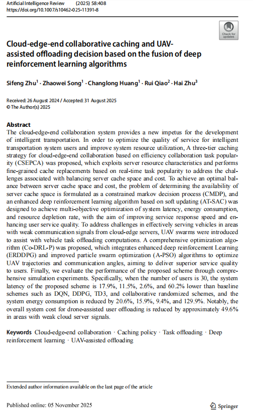 近日,我院朱思峰教授与其指导的研究生宋兆威、黄长龙等联名在人工智能领域重要期刊《Artificial Intelligence Review》上在线发表了学术论文“Cloud-edge-end collaborative caching and UAV-assisted offloading decision based on the fusion of deep reinforcement learning algorithms”。该论文聚焦智能交通系统场景下的用户服务质量问题和系统资源利用率问题,提出了一种基于效率协作任务流行度的云边端三层缓存策略。该策略充分利用服务器资源特性,通过实时任务流行度进行精细化缓存替换,有效解决了服务器缓存空间与成本平衡的难题。为了实现服务器缓存空间与成本之间的最佳平衡,将缓存空间可用性判定问题建模为约束马尔可夫决策过程,并设计了一种基于软更新技术的增强型深度强化学习算法(AT-SAC),用于实现系统延迟、能耗和资源消耗率的多目标优化,从而提升服务响应速度和用户服务体验。针对云边缘服务器通信信号较弱地区的车辆服务难题,引入了无人机群来协助完成任务卸载决策。实验结果表明所提方案有效降低系统延迟和能耗,具有较好的应用价值。