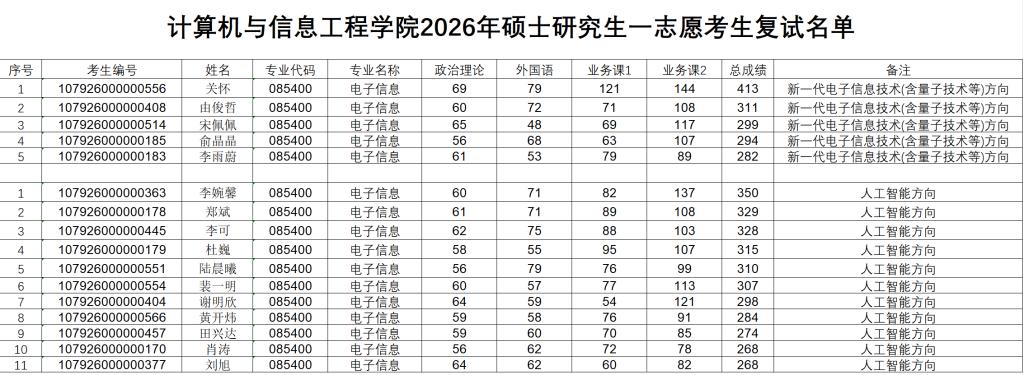 天津城建大学计算机与信息工程学院2026年硕士研究生一志愿考生复试名单
