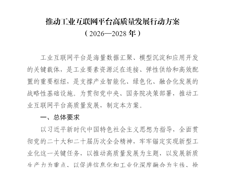 为深入贯彻党中央、国务院有关决策部署,加快工业互联网创新发展,工业和信息化部组织编制了《推动工业互联网平台高质量发展行动方案(2026—2028年)》。现印发给你们,请结合实际抓好落实。